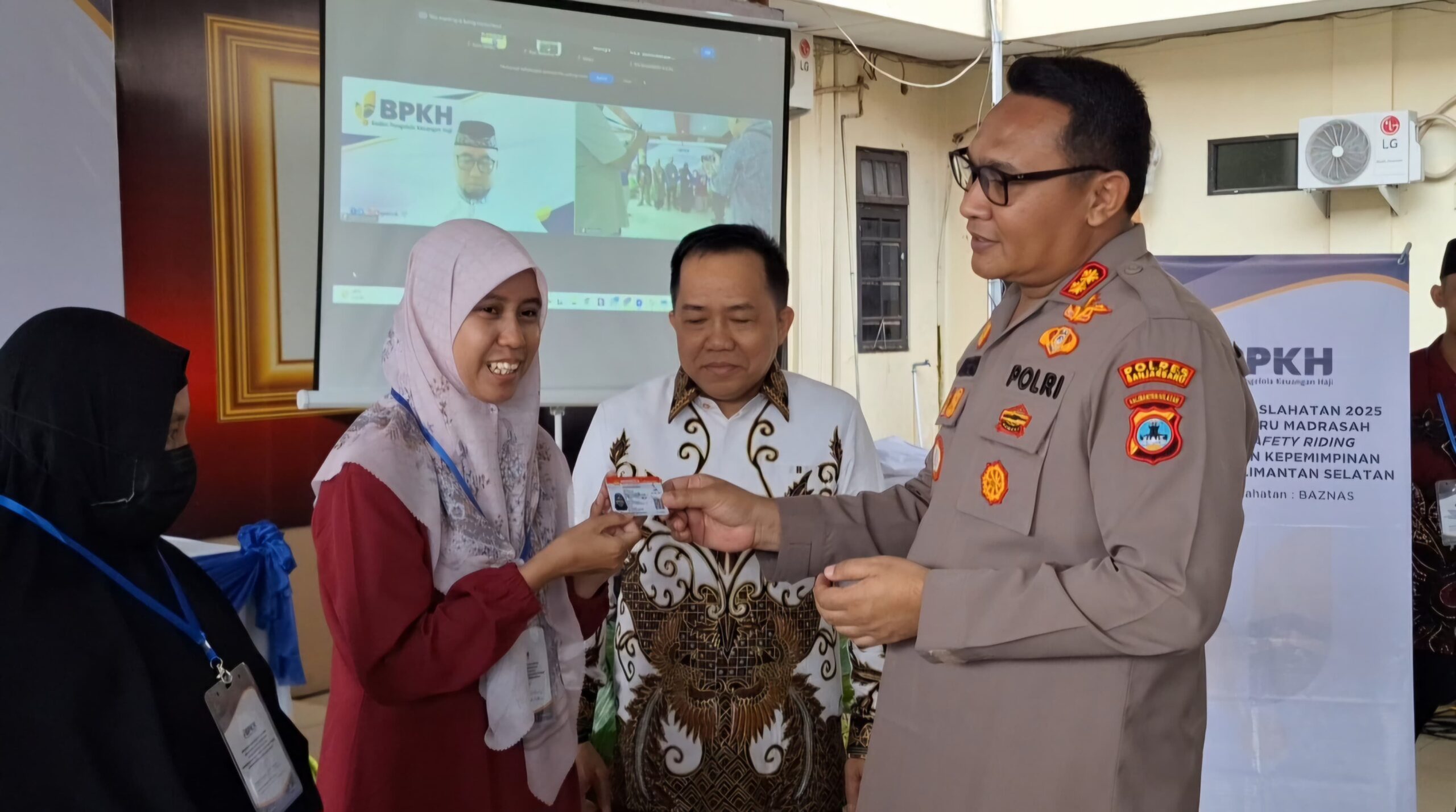 Kapolres Banjarbaru, AKBP Pius X Febry Aceng Loda didamping anggota DPR RI Sudian Noor menyerahkan SIM kepada guru Madrasah secara simbolik. (Foto : Mubarrak/newsway.co.id)