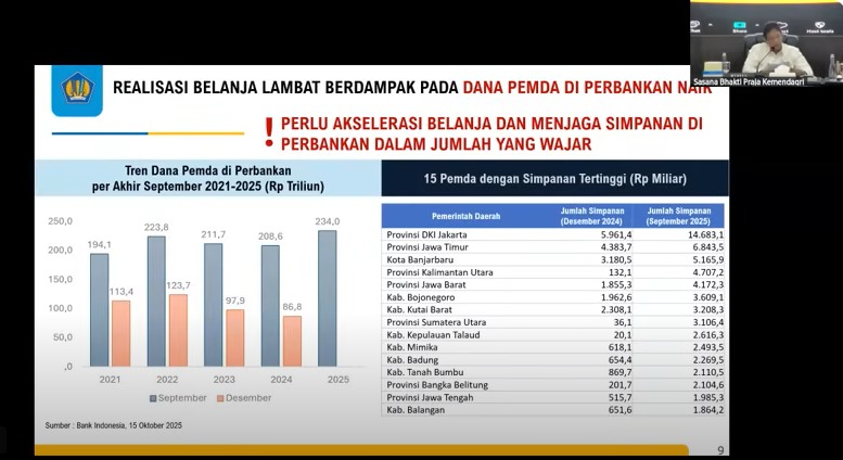 “Yang terjadi justru uang daerah dibiarkan menumpuk di bank. Per 15 September 2025 jumlahnya mencapai Rp 234 triliun. Jadi jelas, ini bukan lantaran uangnya tidak ada, melainkan soal kecepatan eksekusi belanja,” ujar Purbaya.