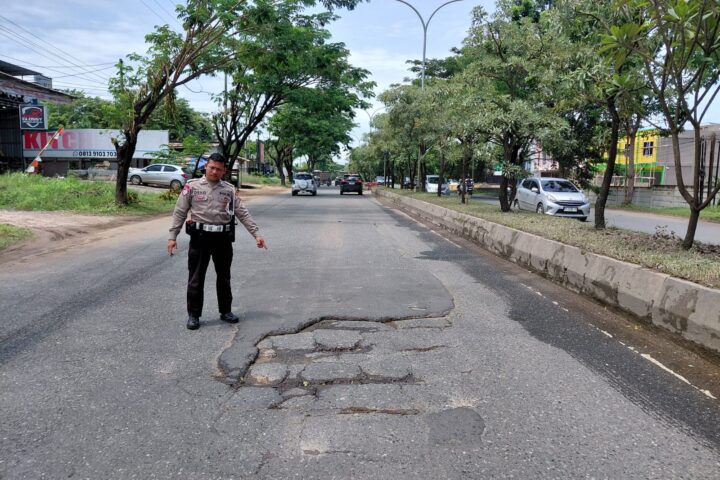 Petugas Sat Lantas Polres Banjarbaru saat menujukan jalan rusak disalah satu ruas jalan utama. (Foto : Humas Polres/newsway.co.id)