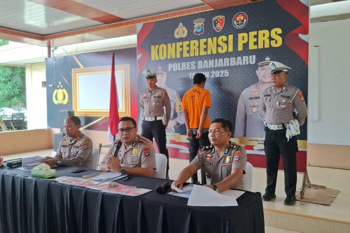 Kapolres Banjarbaru, AKBP Pius X Febry Acemg Loda saat memimpin Lonfrwnsi Pers terkait tabrak lari. (Foto : newsway.co.id)