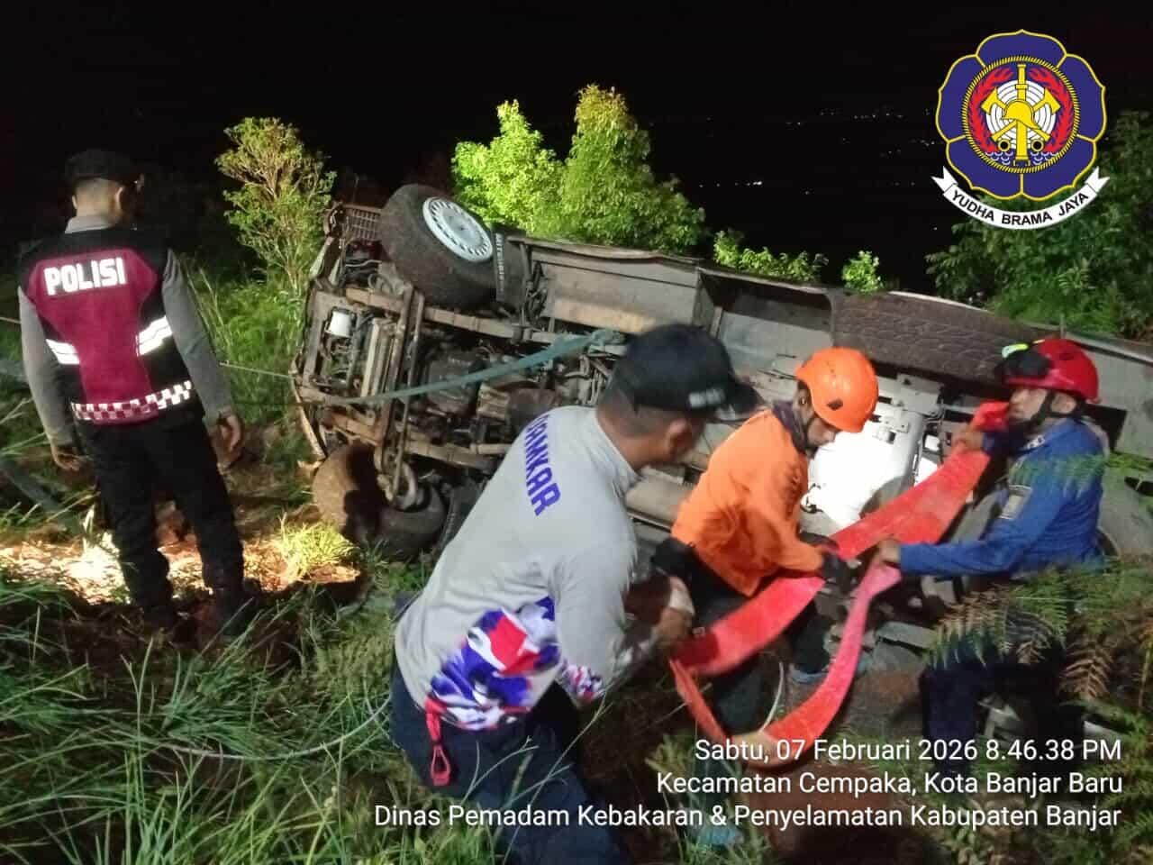 Bus jenis ELF dengan nomor polisi DA 7647 HB tersebut dilaporkan terguling dan berada sekitar 20 meter dari badan jalan, tepatnya di jalur kawasan wisata Tahura Sultan Adam yang dikenal memiliki medan terjal dan tanjakan curam.