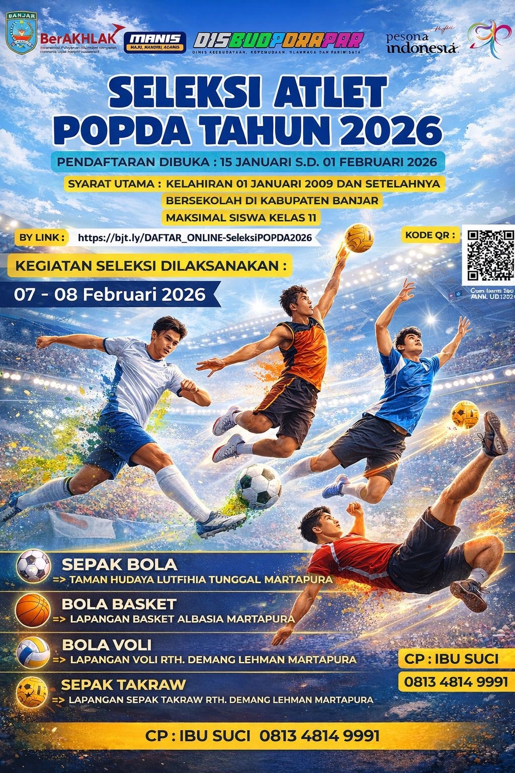 Pendaftaran seleksi atlet pelajar dibuka mulai 15 Januari hingga 1 Februari 2026. Sementara itu, pelaksanaan seleksi direncanakan berlangsung pada 7–8 Februari 2026 di sejumlah lokasi berbeda sesuai cabang olahraga melalui LINK: https://bjt.ly/DAFTAR_ONLINE-SeleksiPOPDA2026 atau melalui kode QR pada poster.