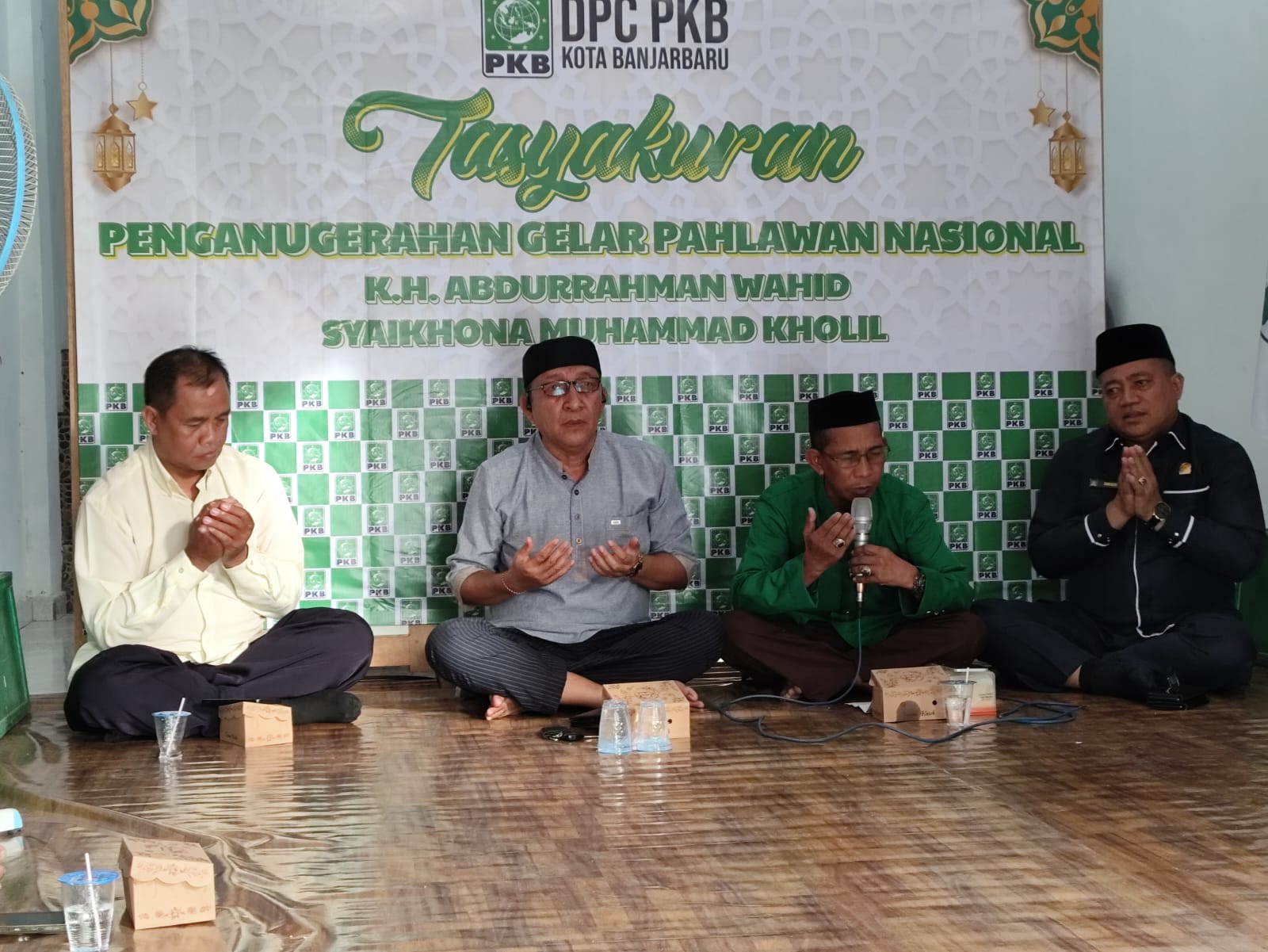NEWSWAY.CO.ID, BANJARBARU — Dewan Pimpinan Cabang Partai Kebangkitan Bangsa (DPC PKB) Kota Banjarbaru menggelar tasyakuran dan doa bersama sebagai bentuk rasa syukur atas penganugerahan gelar Pahlawan Nasional kepada KH Abdurrahman Wahid (Gus Dur) dan KH Syaikhona Mohammad Kholil (Mbah Kholil).