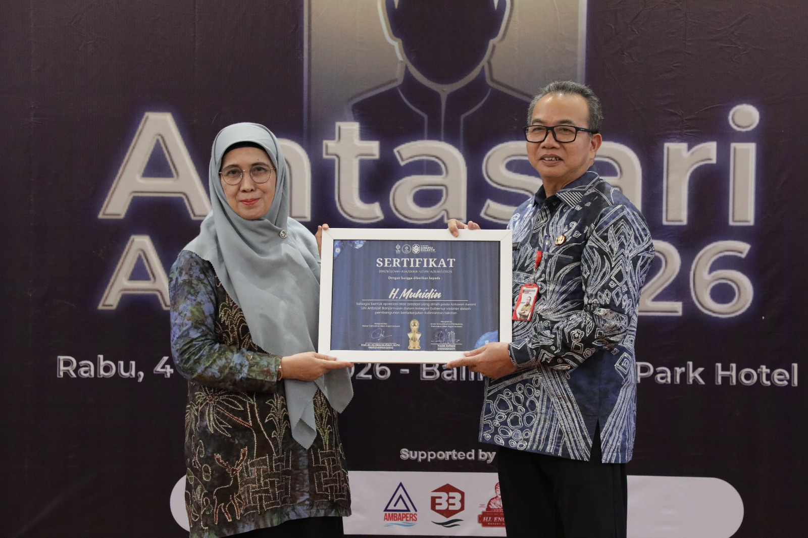 NEWSWAY.CO.ID, KALSEL– Gubernur Kalimantan Selatan Haji Muhidin diwakili Sekretaris Daerah Provinsi Kalimantan Selatan, M. Syarifuddin, menerima penghargaan Antasari Award 2026 yang diselenggarakan Universitas Islam Negeri (UIN) Antasari Banjarmasin, di Hotel Treepark Banjarmasin, Rabu (4/2/2025) pagi.