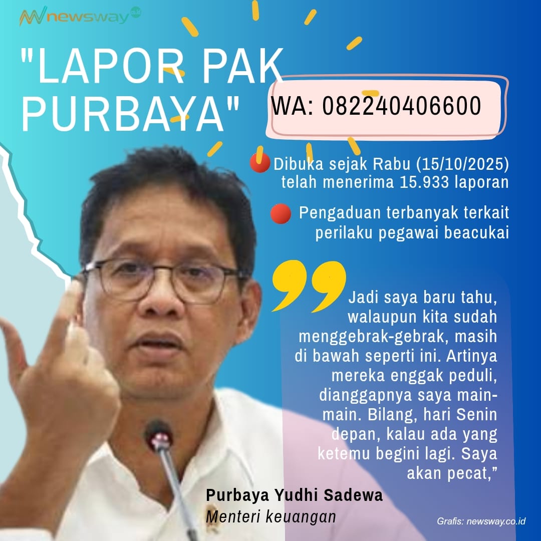 NEWSWAY.CO.ID, JAKARTA – Sejak dibuka Rabu, 15 Oktober 2025, layanan pengaduan “Lapor Pak Purbaya” terkait layanan perpajakan dan bea cukai melalui WhatsApp di nomor 082240406600 telah menerima sebanyak 15.933 WA (WhatsApp) pengaduan.