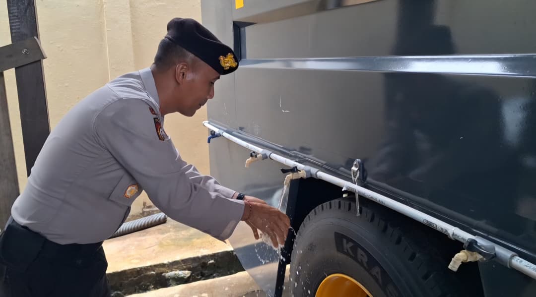 Mobil taktis Water Cannon yang biasanya digunakan untuk pengendalian massa, kini dialihfungsikan menjadi sarana tempat wudhu portabel bagi para jamaah.