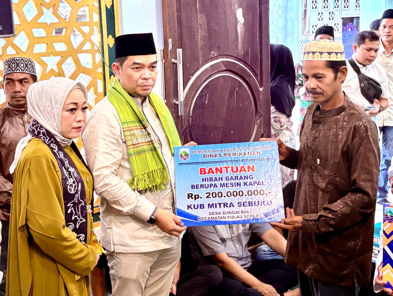 Serta diserahkan juga hibah barang berupa mesin kapal sebesar Rp. 200. 000. 000,- dan peralatan pengolahan pemasar dan pengumpul hasil perikanan sebesar Rp. 100. 000. 000,- dari Dinas Perikanan.