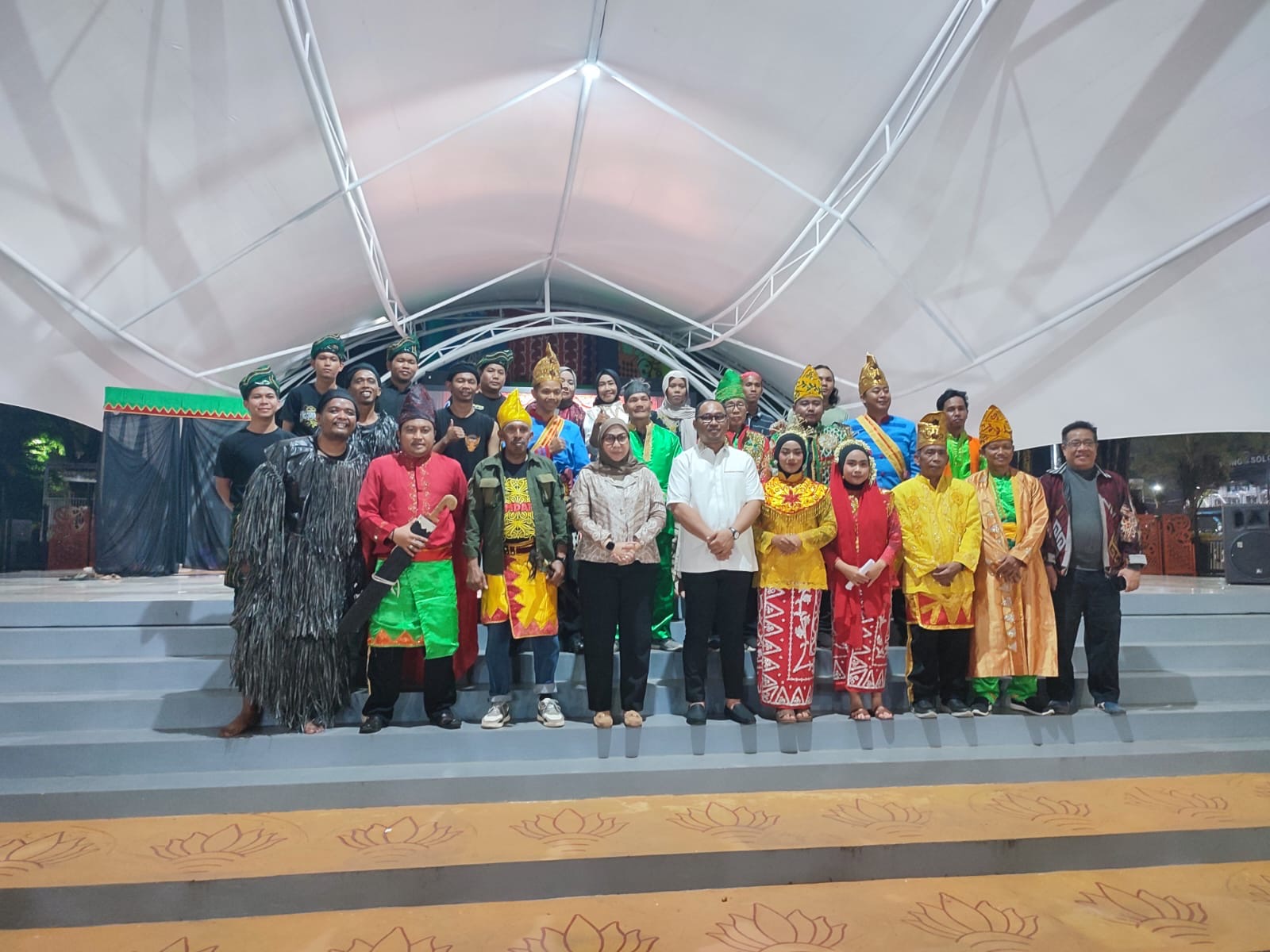 Pementasan Mamanda malam itu mengangkat kisah Putri Raja Kencana Emas yang menimba ilmu demi membawa kemajuan bagi negerinya. Alur cerita dibalut dialog improvisatif dan humor segar yang menjadi ciri khas Mamanda, membuat penonton larut dalam pertunjukan.