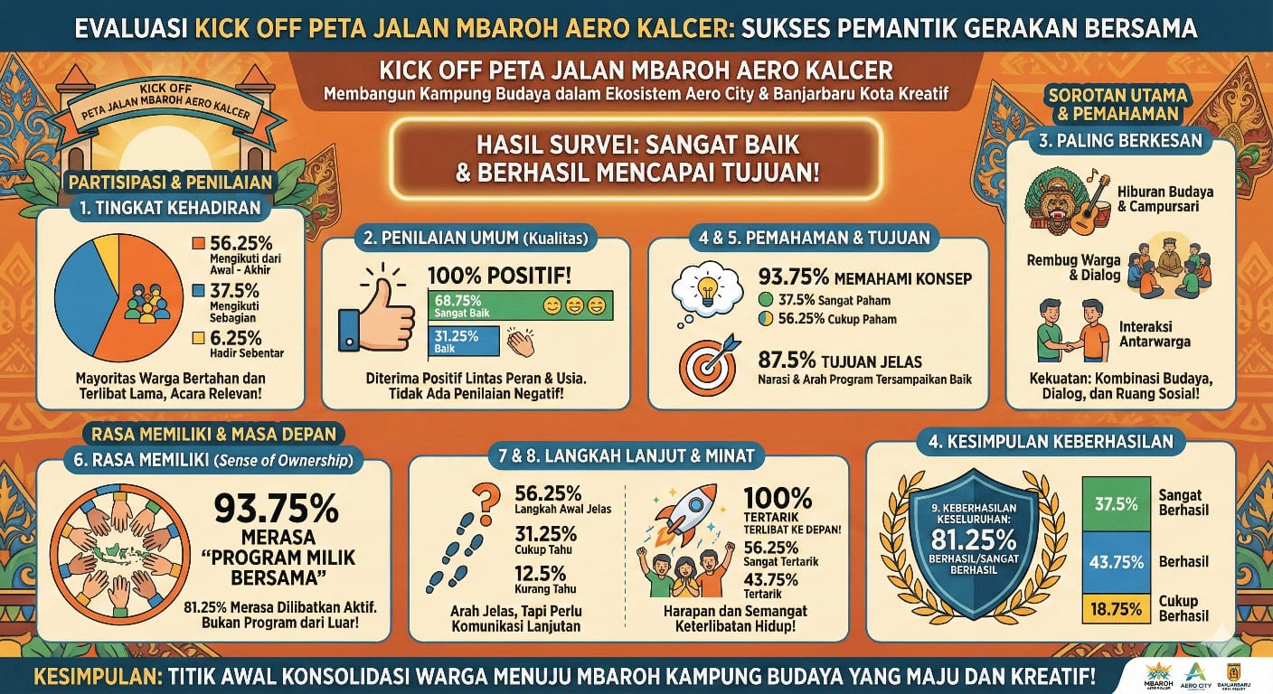 Berdasarkan penilaian responden secara keseluruhan, tingkat keberhasilan kegiatan dinilai sangat tinggi, yakni sebesar 81,25 persen. Angka ini memperkuat kesimpulan panitia bahwa Kick Off Peta Jalan Mbaroh Aero Kalcer 2026 telah mencapai tujuan utamanya, yakni membangun kesadaran kolektif, rasa kepemilikan, dan komitmen bersama warga terhadap pengembangan kampung budaya.