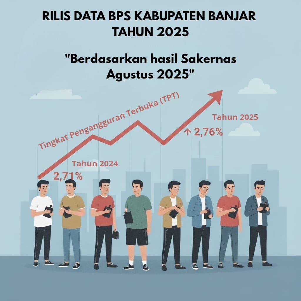 NEWSWAY.CO.ID, MARTAPURA – Badan Pusat Statistik (BPS) Kabupaten Banjar berdasarkan hasil Survei Angkatan Kerja Nasional (Sakernas) Agustus 2025 mencatat Tingkat Pengangguran Terbuka (TPT) pada Agustus 2025 sebesar 2,76 persen, mengalami kenaikan tipis dibandingkan tahun sebelumnya yang tercatat 2,71 persen.