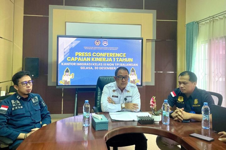 Kepala Kantor Imigrasi Kelas III Non TPI Balangan, Muhammad Hariyadi (tengah) memberikan statement dalam konferensi pers di kantornya. (Foto: nasrullah/newsway.co.id)